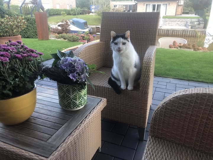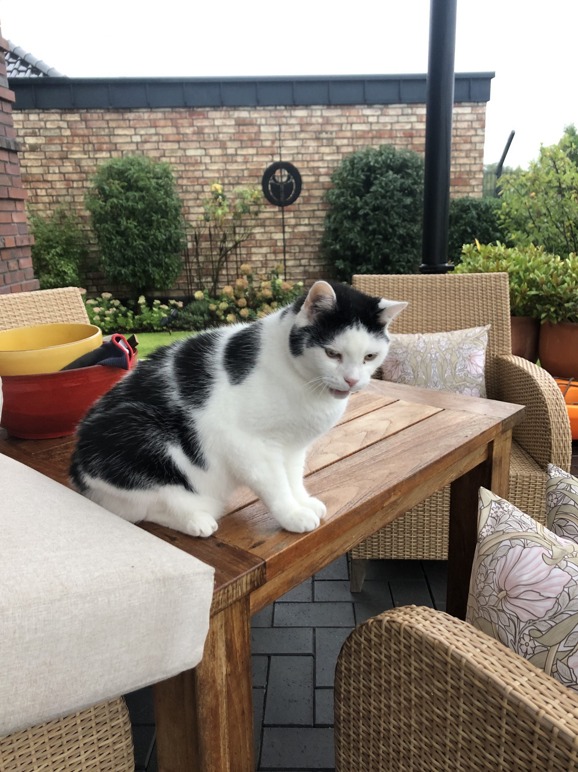 „Endlich haben meine Dosenöffner einen prinzgerechten Tisch auf die Terrasse gestellt. Ich, Quincy, der Inselkönig, könnte mich freuen, es fehlt so einiges an der perfekten Gestaltung eines katerfreundlichen Frühstücksbüffets. Natürlich goutiere ich den Blütenzauber auf dem Tisch, die gemeine Bauernhortensie gehört jedoch nicht zu meinem Speiseplan. Mindestens erwartet hätte ich mein lactosefreies Milchcocktail, aber nicht einmal an ein weiches und warmes Polster für den Po – es ist inzwischen empfindlich kalt im nördlichen Emsland – wurde gedacht. Ich protestiere erneut, auch wenn es keiner hört. Diese Dosenöffner sind unterste Schublade!“