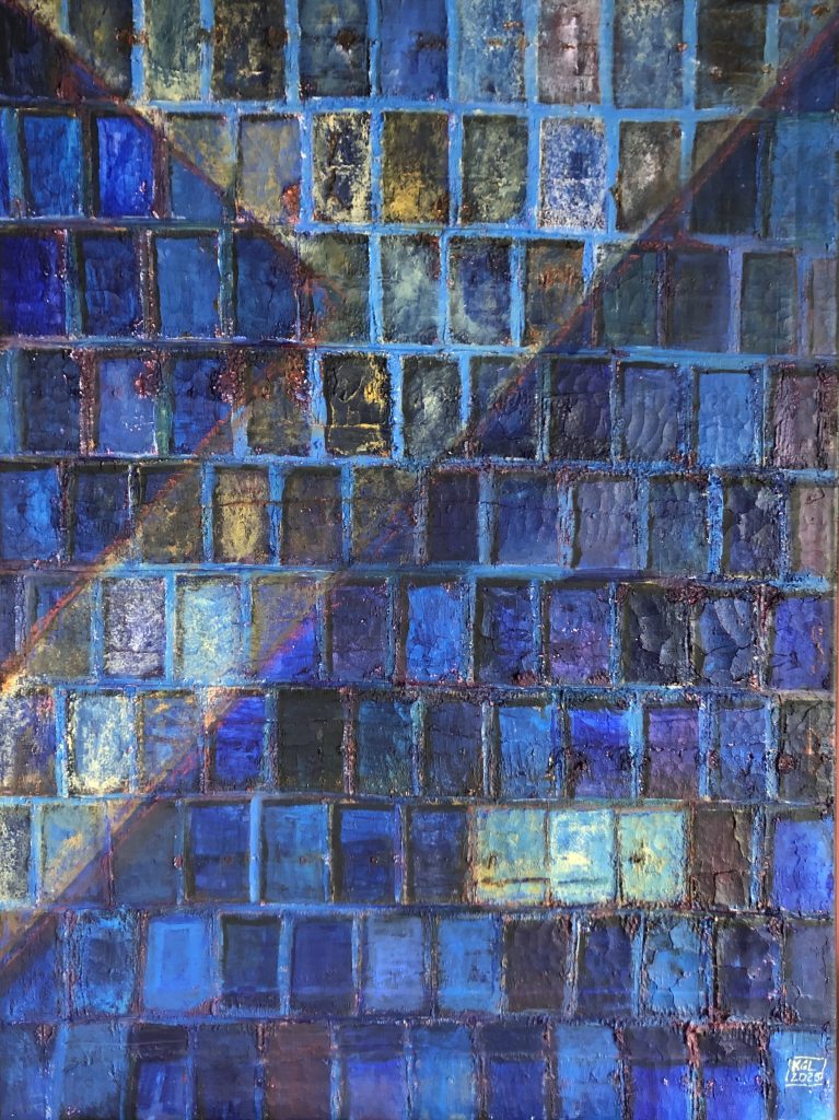 Mir kommt die Idee, für die Ränder der Rechtecke ein Hellblau zu verwenden. Das wirkt doch gleich viel besser. Aber die Hell-/Dunkelbereiche machen noch immer keinen Sinn und ich übermale alle Rechtecke. Quasi ein Reset. Das Ergebnis: Ich bin zufrieden mit der Farbe der Ränder. Sonst bleibt das Bild für mich uninspiriert. Ich grüble.