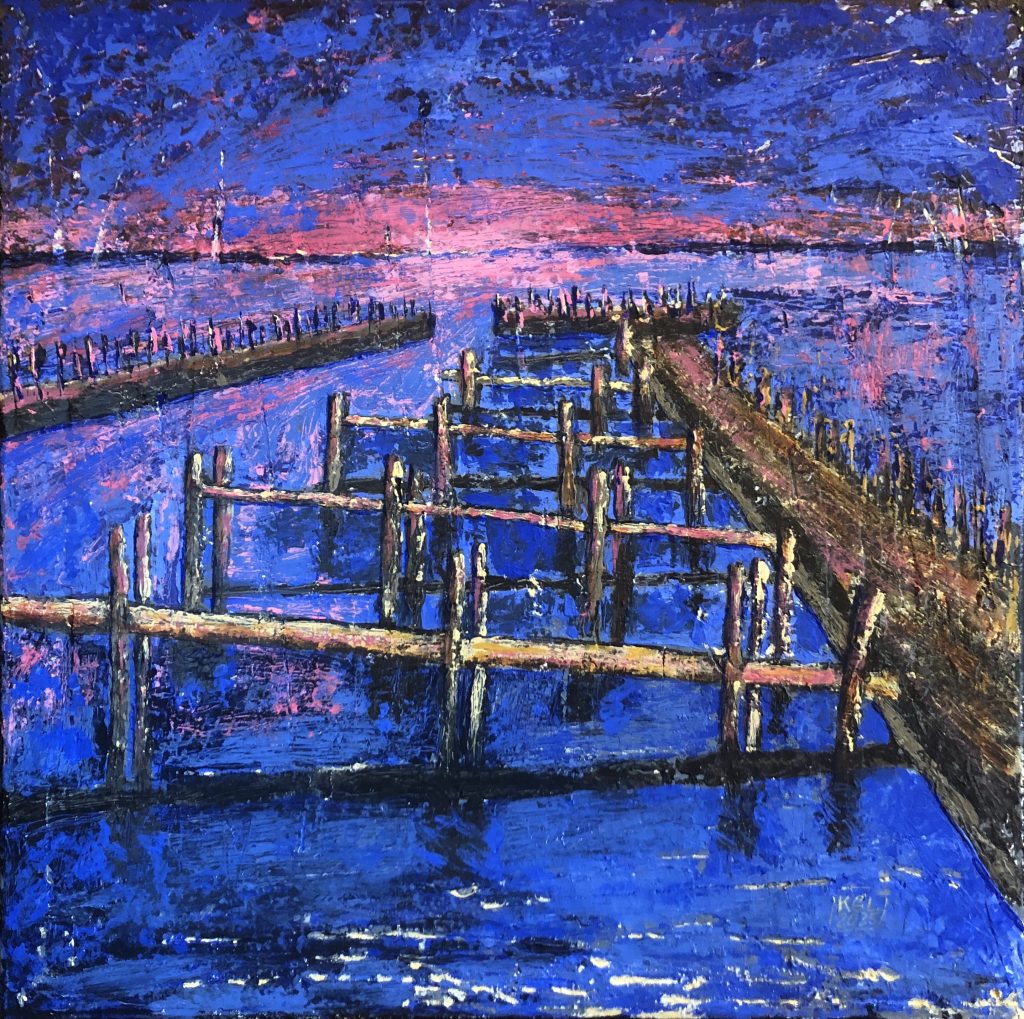 Grundlage für diese Werk in Mischtechnik (Gessogrundierung und Acryl) ist ein Foto, das ich vor einigen Jahren am Bad Zwischenahner Meer geschossen habe. Ein verwaister Holzanleger. Der See grau. Der Himmel grau. Keine Sonne.